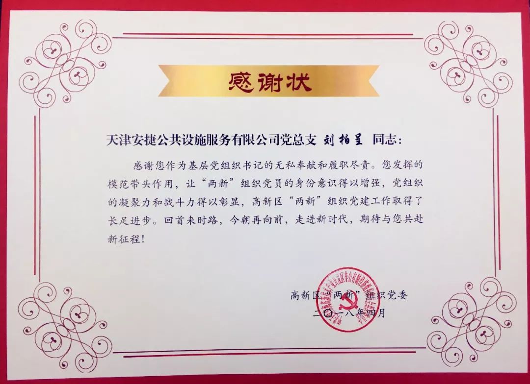 经过高新技术企业党委2017年度工作考核,天津BB贝博艾弗森公共设施服务有限公司获得“优秀”的党组织荣誉称号,同时,BB贝博艾弗森董事长刘柏呈同志获得“优秀”的党组织负责人荣誉称号。