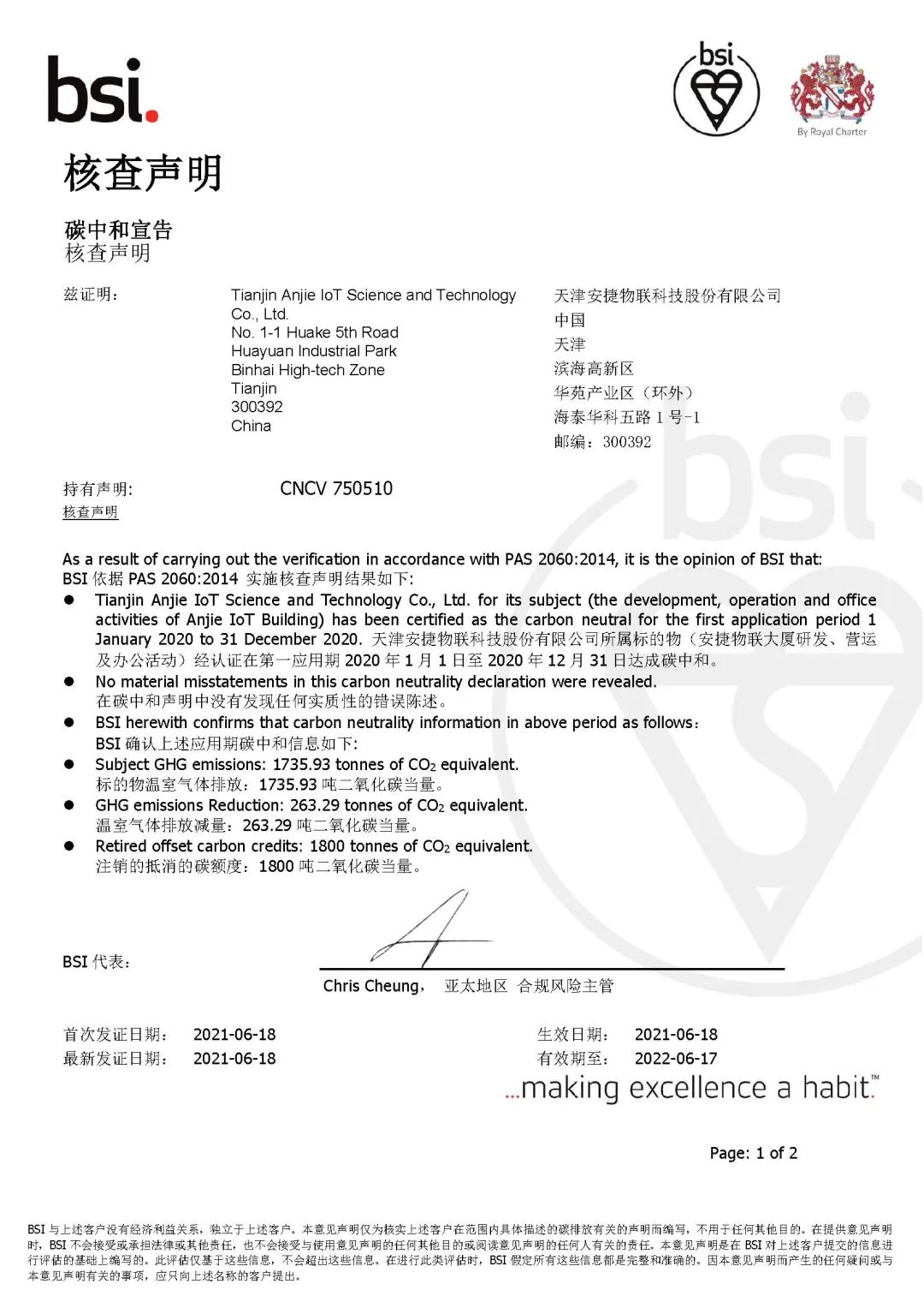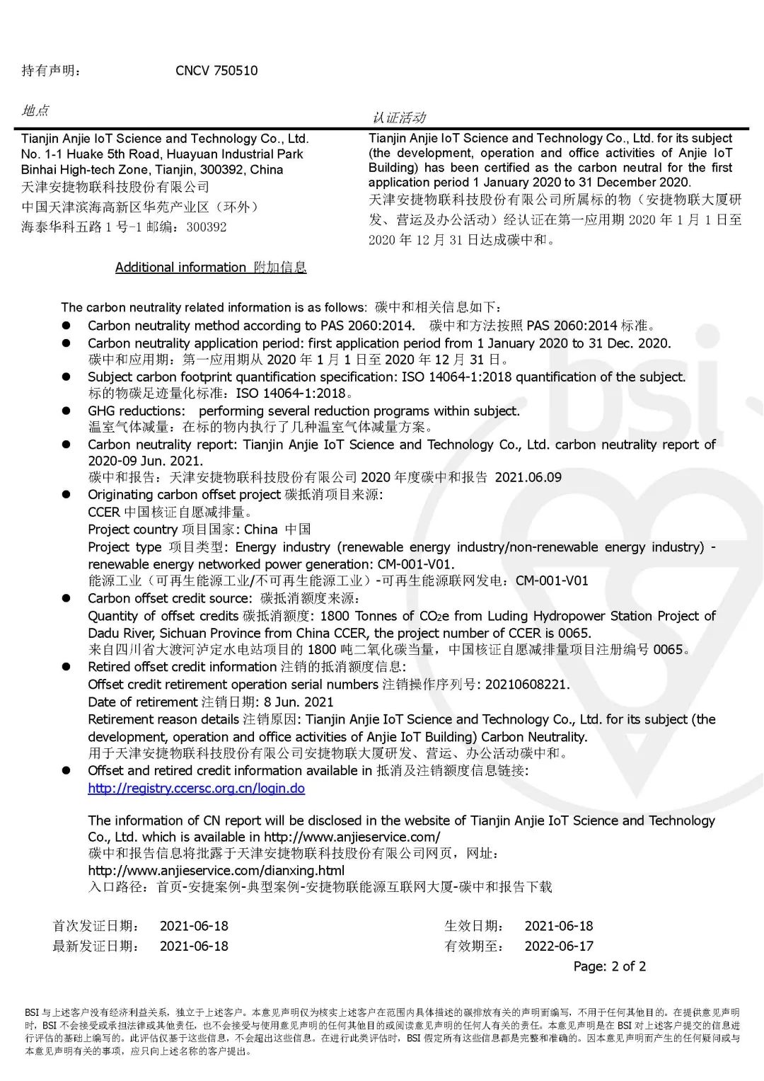 随后,BB贝博艾弗森物联通过采购、抵消1800吨中国核证自愿减排量(CCER),达成了2020年度的碳中和目标,并顺利通过PAS 2060标准认证。