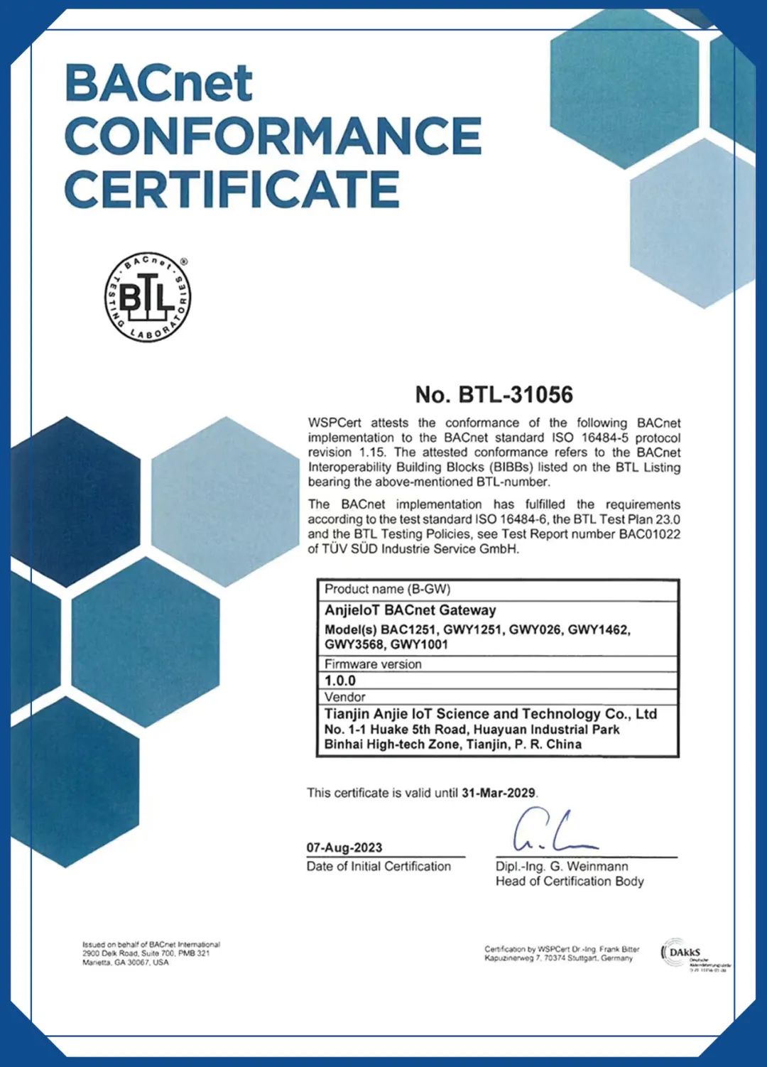 近日,由天津BB贝博艾弗森物联科技股份有限公司自主研发设计的GWY系列智能网关产品成功通过BTL(BACnet Testing Laboratories )认证,该项认证是国际楼宇自控领域的第一权威认证。