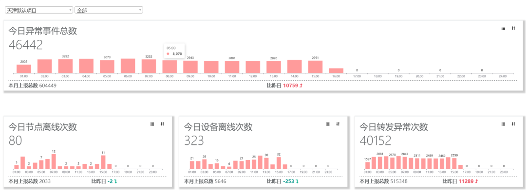 • 云平台实时监控网关和设备的运行状态,分类统计和显示异常情况。